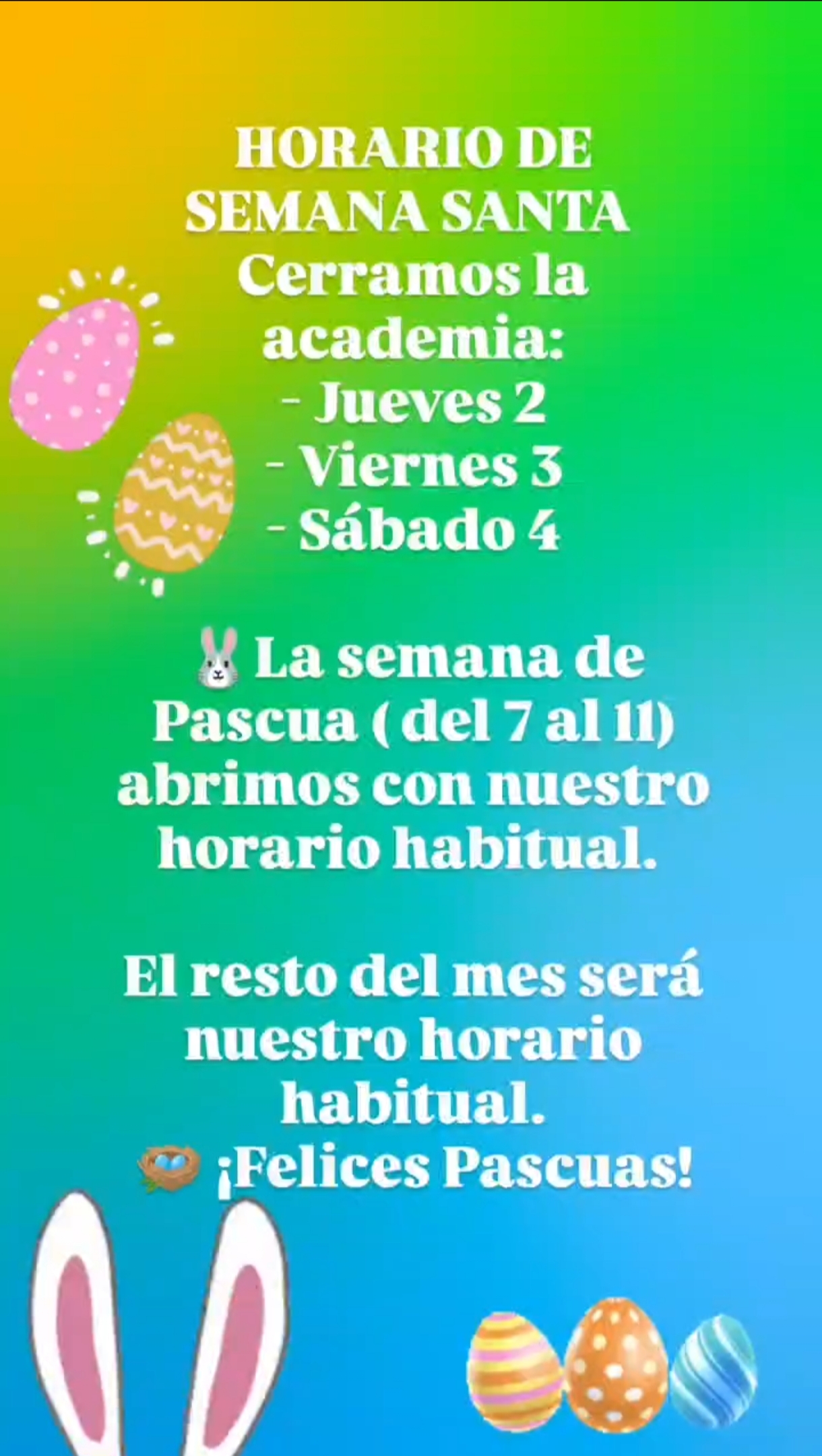 🐰La semana de Pascua ( del 7 al 11) abrimos con nuestro horario habitual.