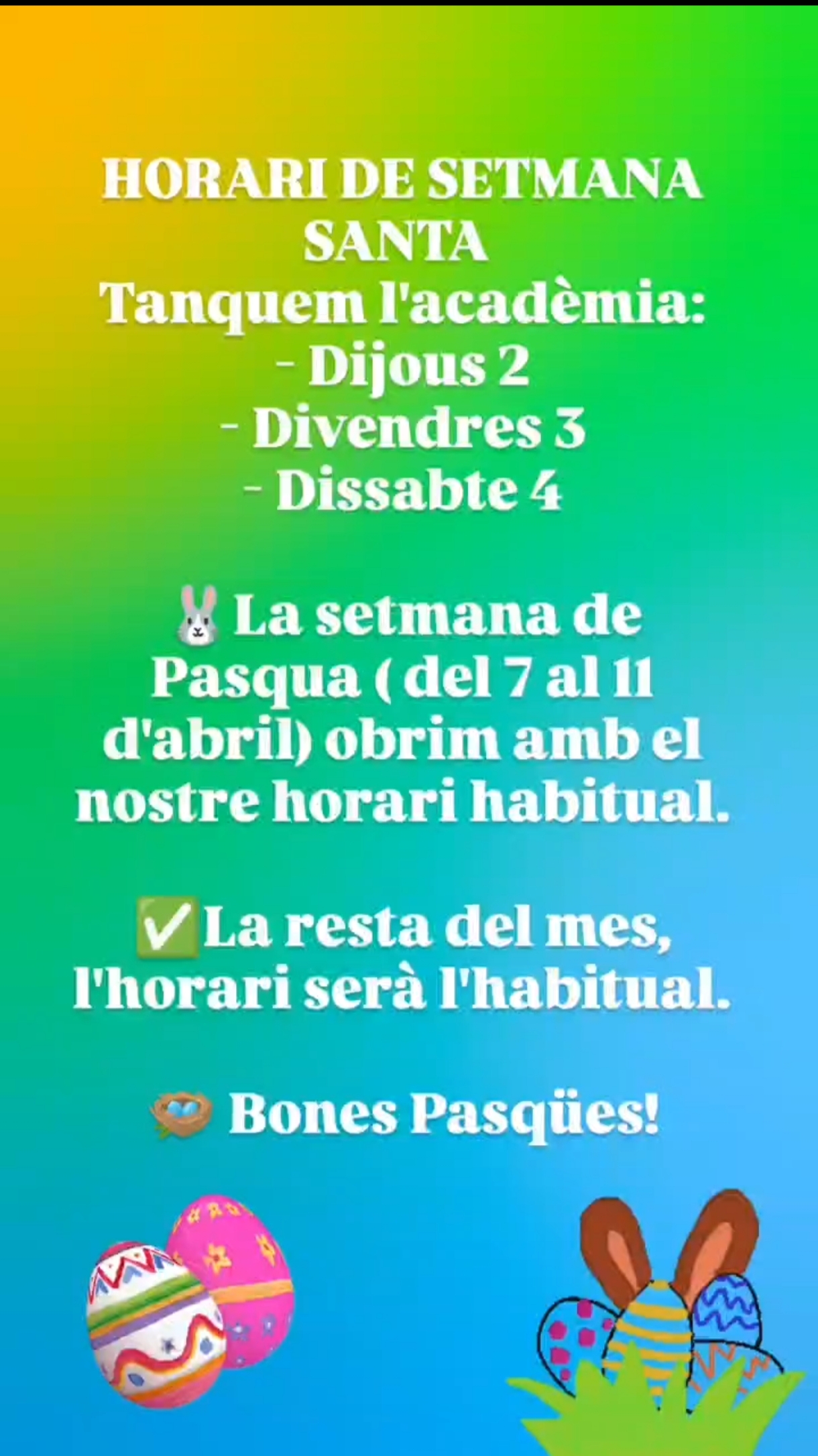 🐰La setmana de Pasqua ( del 7 al 11 d’abril) obrim amb el nostre horari habitual.